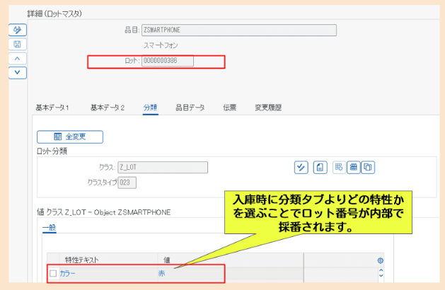 ロット特性の設定を行う場合、品目マスタ(T-CODE:MM01/MM02/MM3)の分類タブにてロットのクラス(クラスタイプ:023)と紐付けることができます。