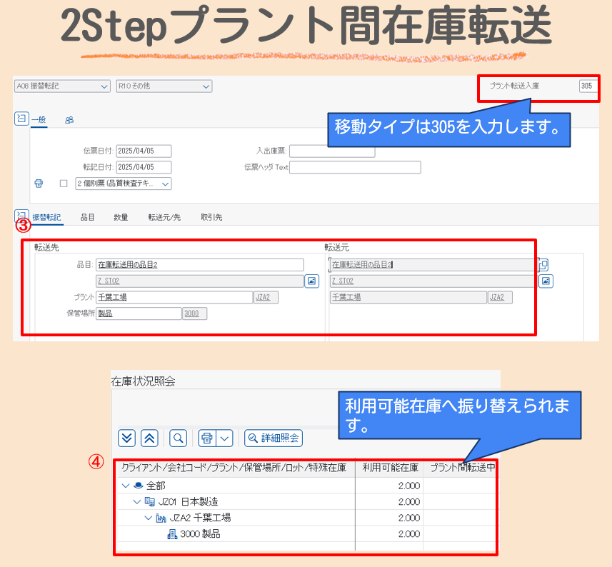 2Stepのプラント間の在庫転送は1Stepとは異なり、在庫が転送中の在庫ステータスとなることが特徴的です。今回はT-CODE:MIGOで行う2stepプラント間転送を紹介します。